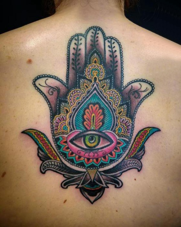 女生背部彩绘水彩素描文艺经典吉祥法蒂玛之手纹身图片