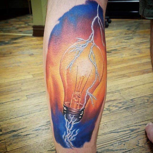 男生小腿上彩绘渐变简单线条闪电和灯泡纹身图片