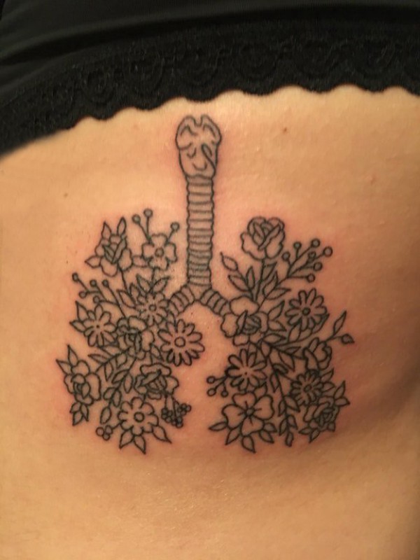 女生侧腰上黑色几何简单线条植物花朵型肺部纹身图片