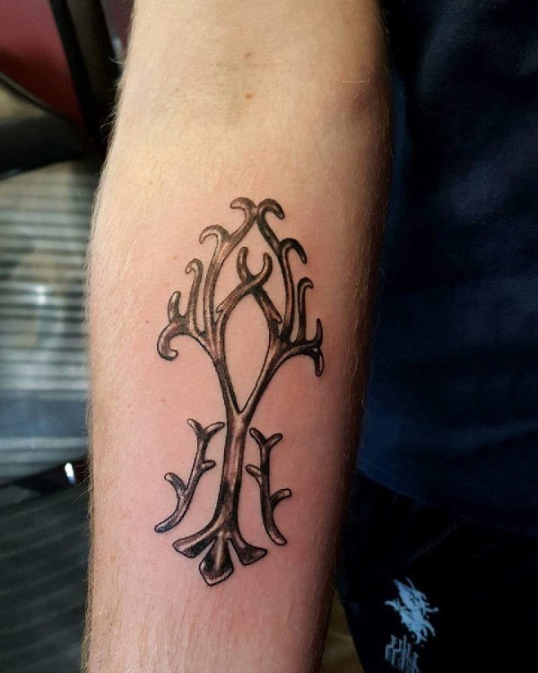 男生手臂上黑色点刺简单抽象线条植物树枝纹身图片