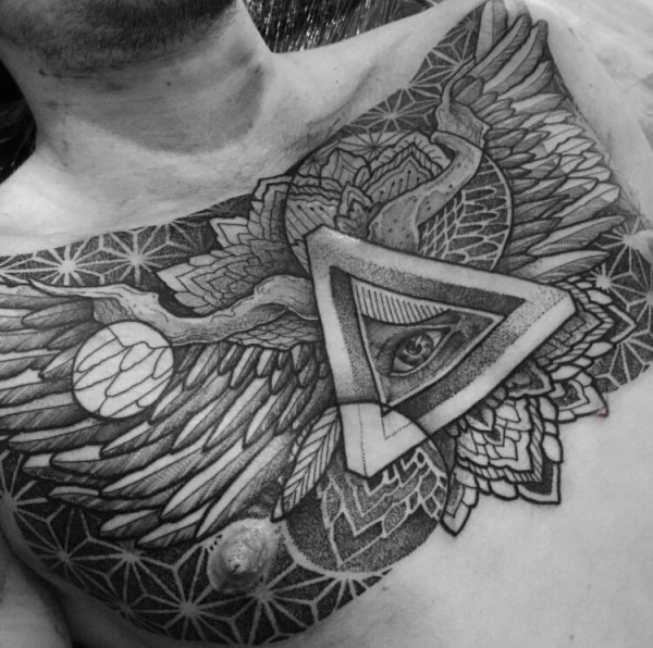 男生胸部黑色点刺简单线条翅膀和上帝之眼纹身图片