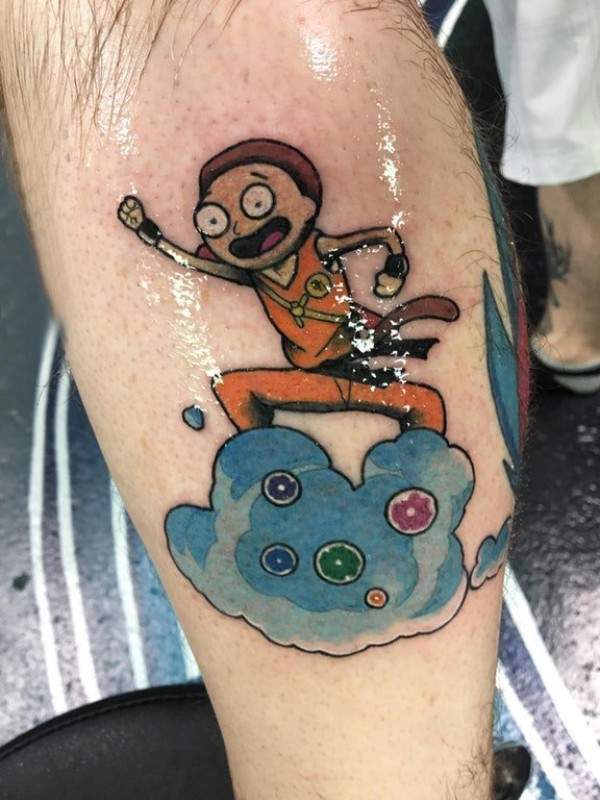 男生小腿上彩绘渐变几何线条卡通云朵和人物纹身图片