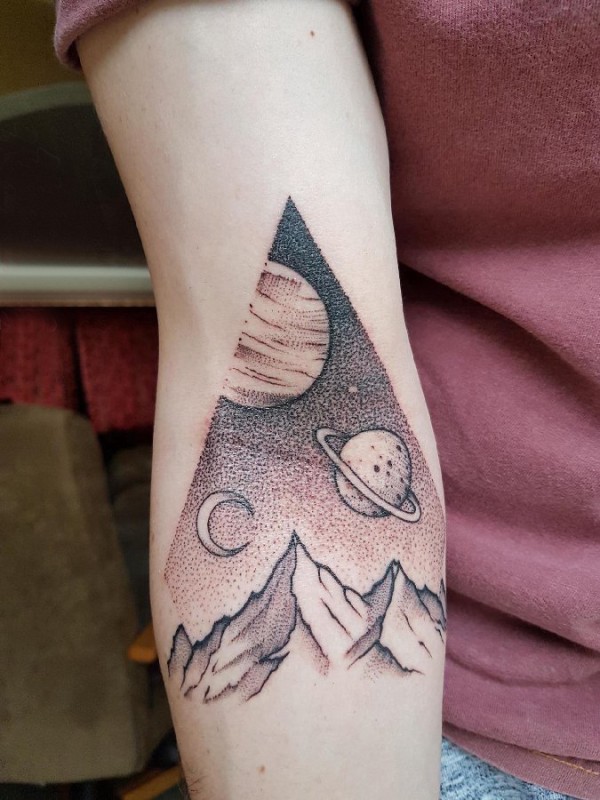 女生手臂上黑色点刺几何抽象线条星球和山脉纹身图片