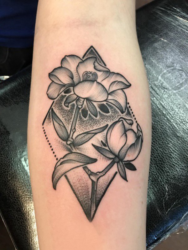 女生手臂上黑灰素描点刺技巧文艺唯美花朵纹身图片