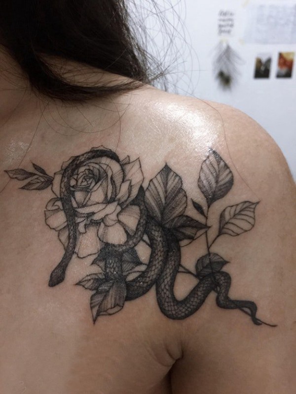 女生后背上黑色点刺简单线条植物花朵和蛇纹身图片