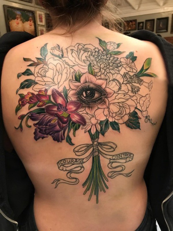 女生后背上彩绘渐变简单线条植物花束和眼睛纹身图片