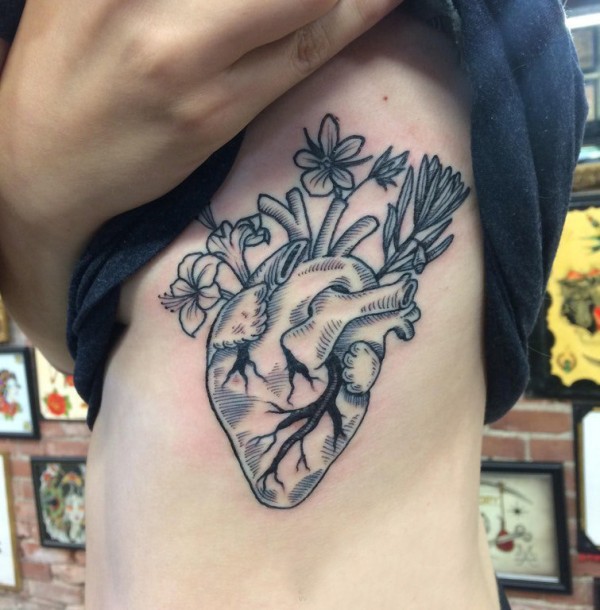 男生侧腰上黑色点刺简单线条心脏和花朵纹身图片
