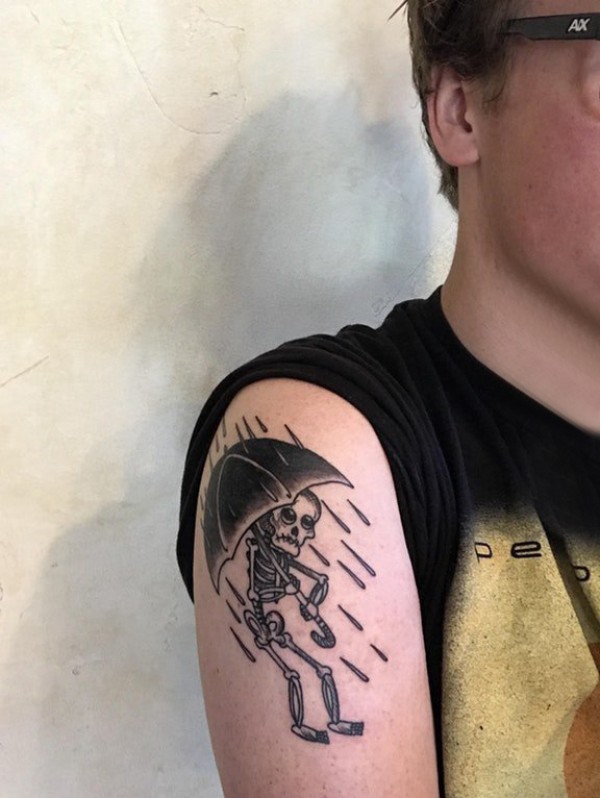 男生大臂上黑色点刺简单线条雨伞和骷髅纹身图片