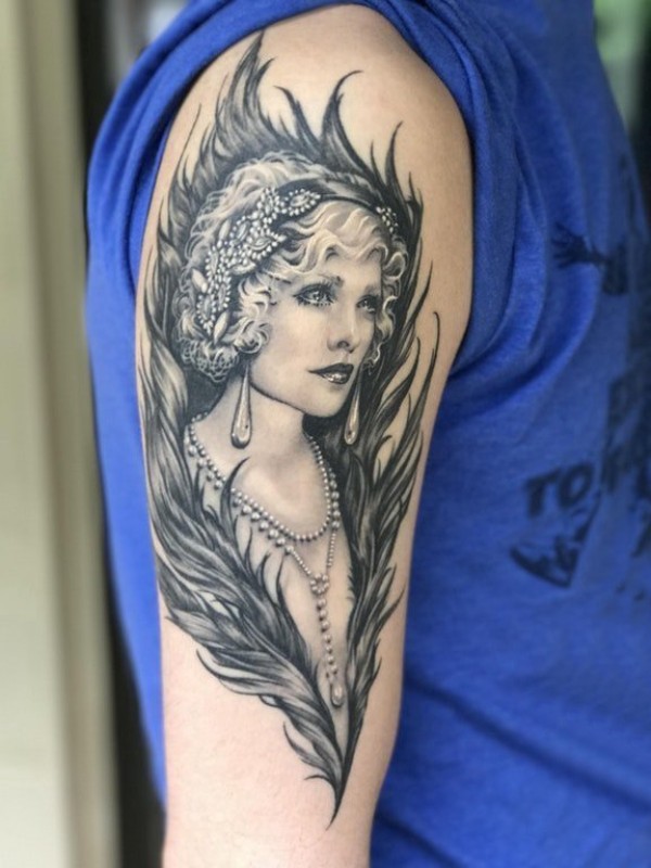 男生手臂上黑色点刺抽象线条羽毛和人物肖像纹身图片