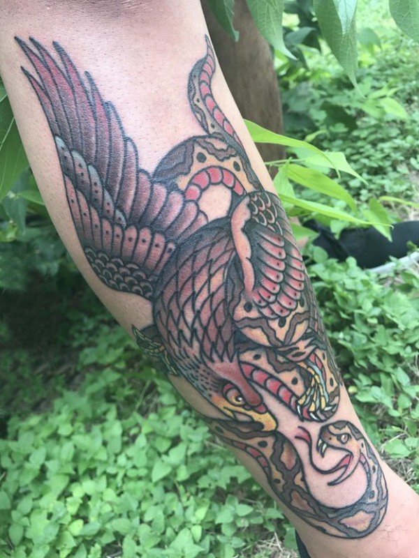 男生小腿上彩绘渐变简单线条小动物蛇和老鹰纹身图片