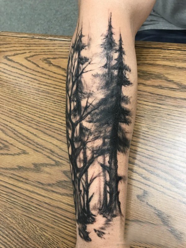 男生手臂上黑色水墨点刺技巧抽象线条植物大树纹身图片