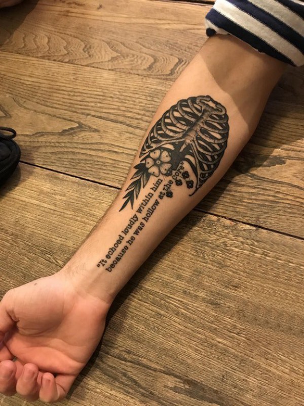 男生手臂上黑色点刺简单线条花朵和骨架纹身图片