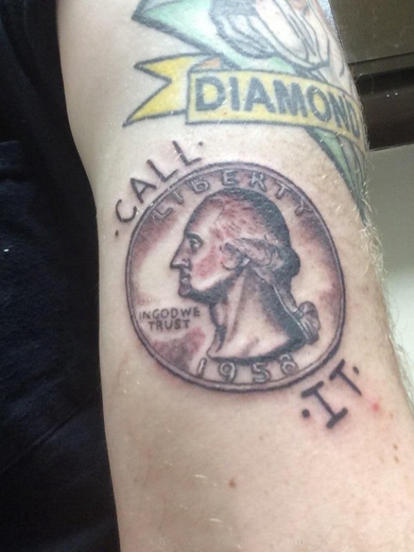男生手臂上黑色点刺几何简单线条货币纹身图片