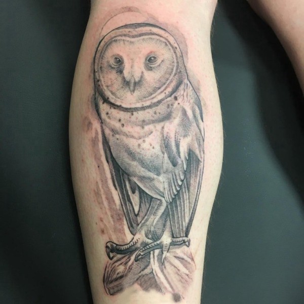 男生手臂上黑灰素描点刺技巧文艺猫头鹰纹身图片