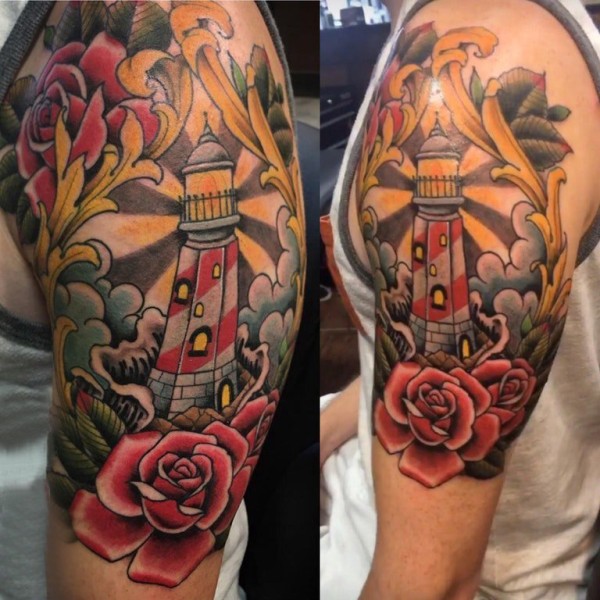 男生手臂上彩绘水彩素描经典灯塔花朵纹身图片