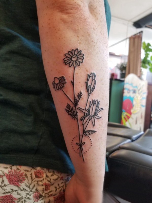 男生手臂上黑色线条文艺唯美花朵精美纹身图片