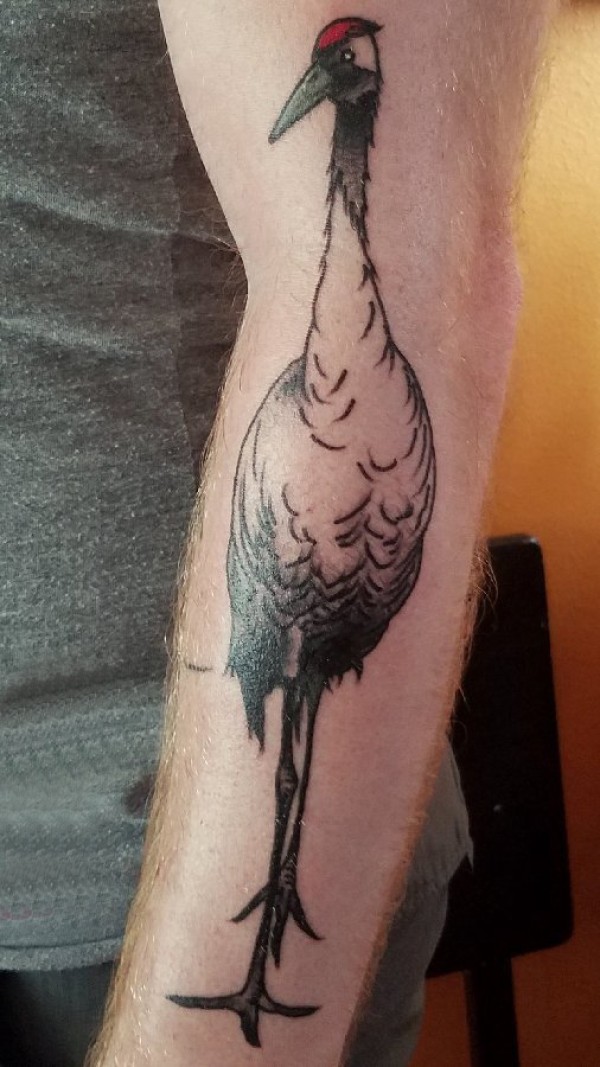 男生手臂上黑色点刺简单抽象线条小动物白鹤纹身图片