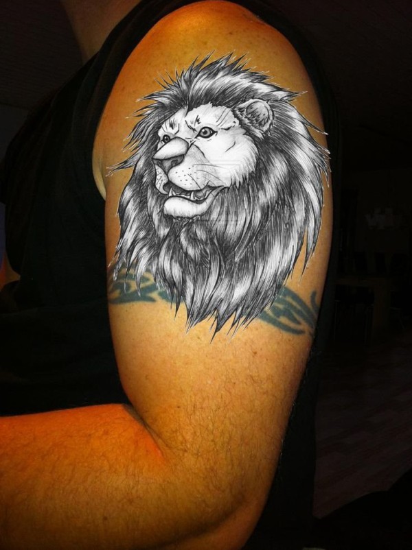 男生手臂上黑灰素描点刺技巧霸气狮子纹身图片
