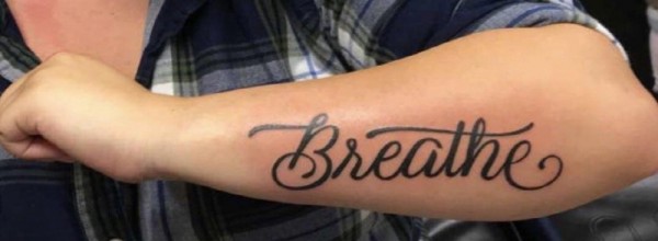 男生手臂上黑色简单抽象线条英文单词纹身图片
