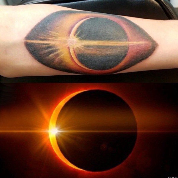 男生手臂上彩绘渐变几何简单线条日全食纹身图片