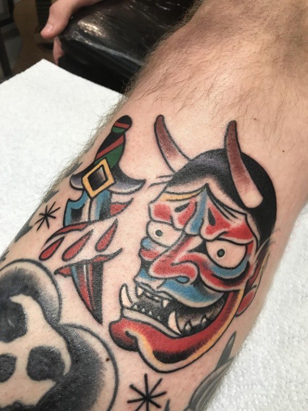 般若面具纹身男生小腿上匕首和般若面具纹身图片