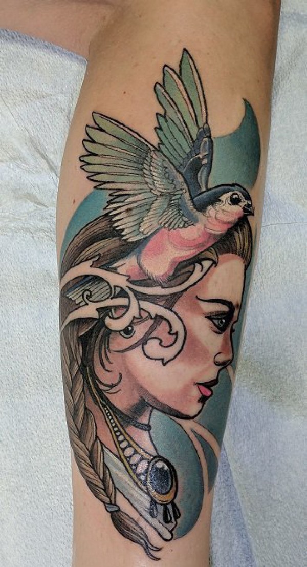 女生小腿上彩绘渐变简单线条小鸟和人物肖像纹身图片