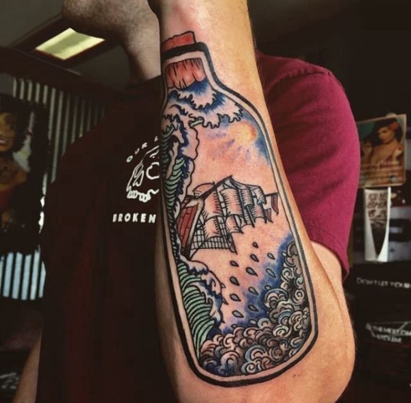 帆船纹身男生手臂上彩色的帆船纹身图片