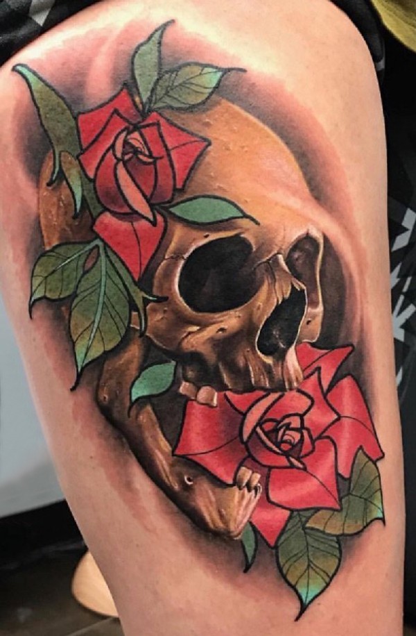 女生手臂经典潮流的骷髅与玫瑰花纹身图案