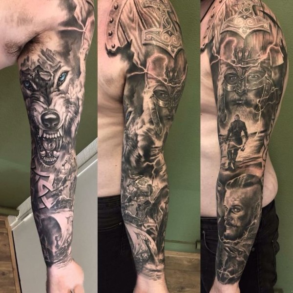 花臂纹身男生手臂上狼图腾花臂纹身图片