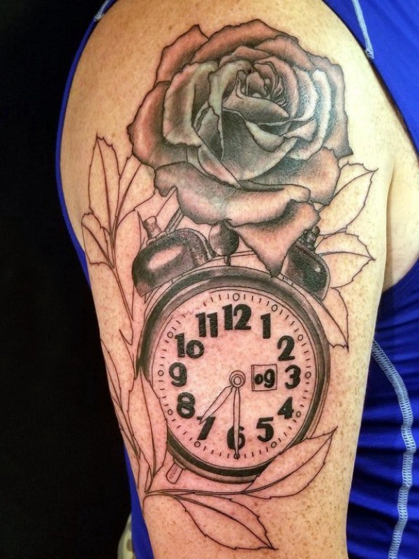 男生大臂上黑色点刺几何抽象线条花朵和时钟纹身图片