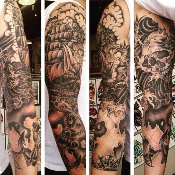 花臂纹身男生手臂上黑灰的花臂纹身图片