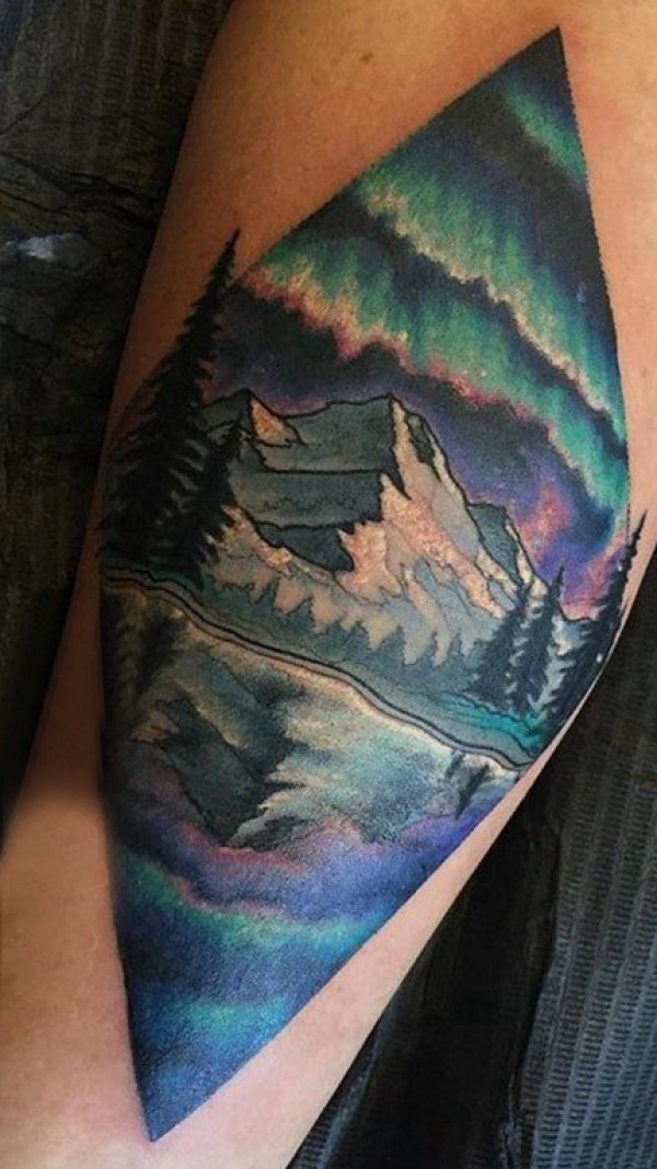 男生小腿上彩绘渐变几何简单线条山水风景纹身图片