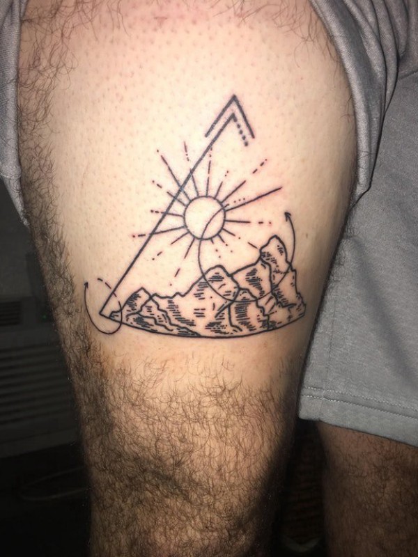 太阳纹身男生大腿上太阳和山峰纹身图片