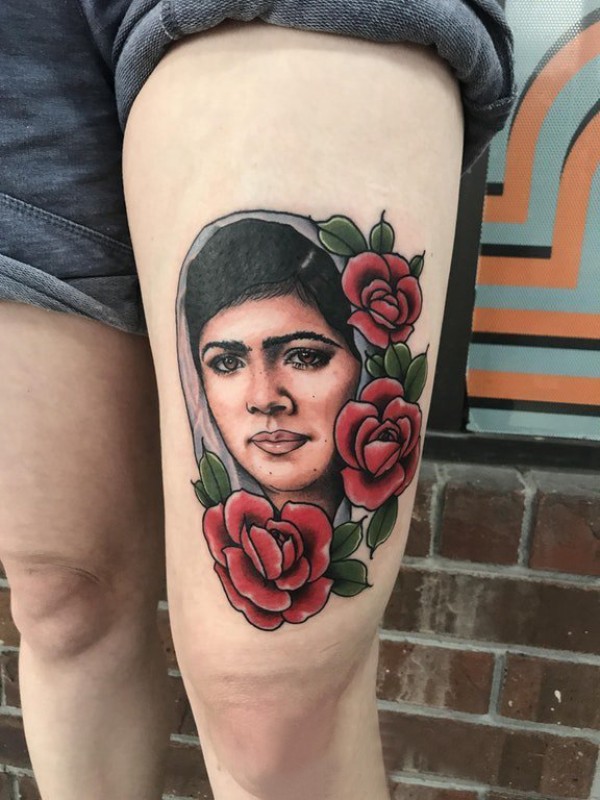 人物肖像纹身女生大腿上花朵和人物肖像纹身图片