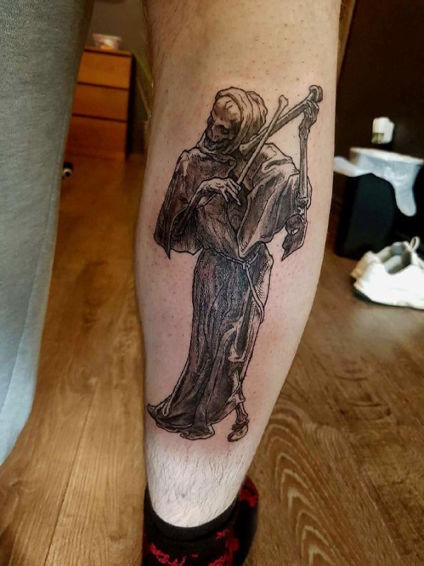 骷髅纹身 男生小腿上黑色的骷髅纹身图片