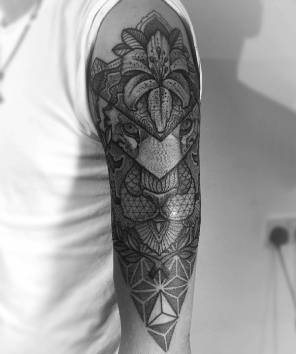 老虎图腾纹身 男生大臂上花朵和老虎纹身图片