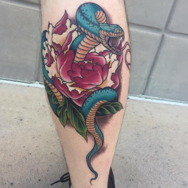 蛇花纹身女生小腿上彩色的蛇花纹身图片