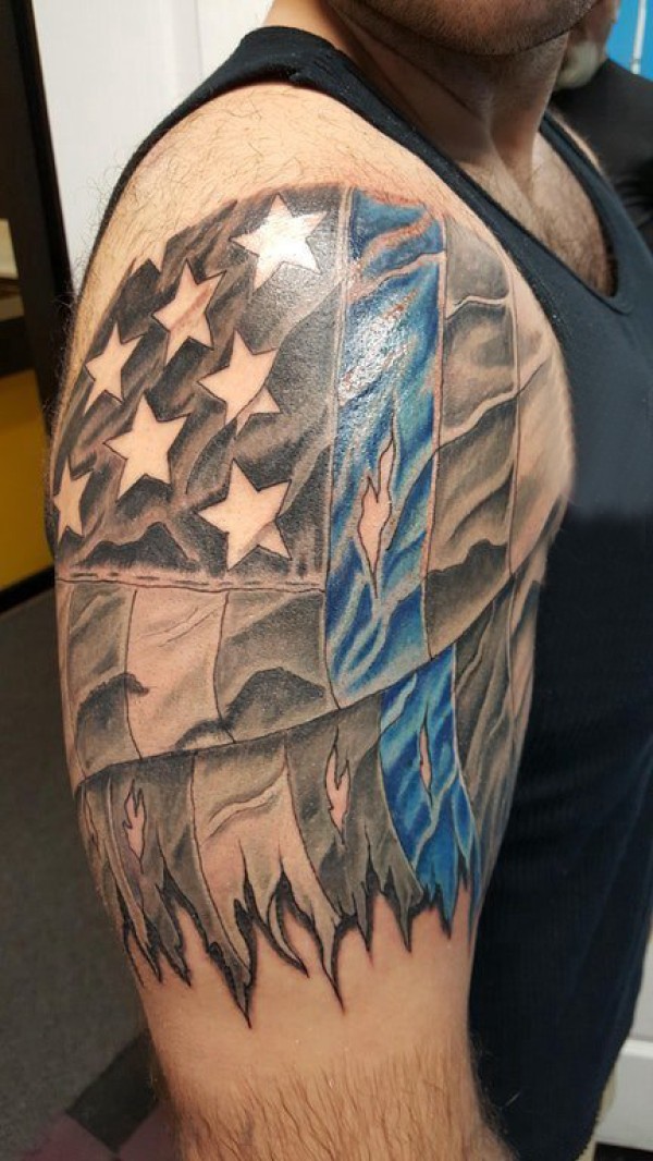 旗帜纹身男生手臂上黑灰的旗帜纹身图片