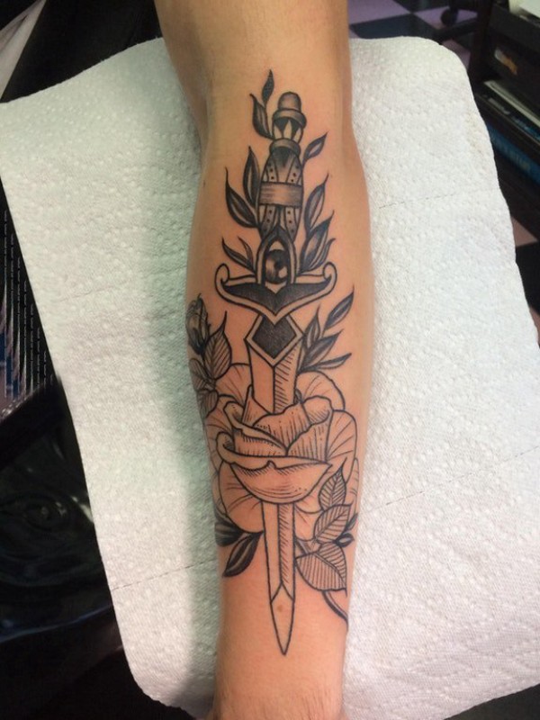欧美匕首纹身男生手臂上花朵和匕首纹身图片