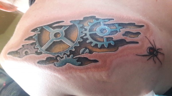 机械齿轮纹身 男生后背上彩色的机械齿轮纹身图片