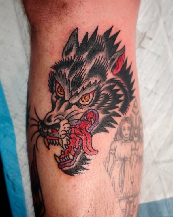 滴血狼头纹身图片 男生小腿上彩色的狼头纹身图片