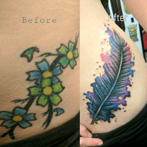 纹身覆盖女生侧腰上纹身覆盖羽毛纹身图片
