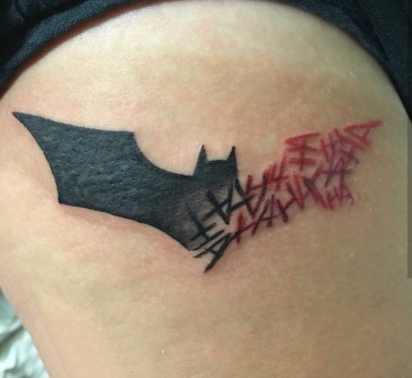 蝙蝠侠标志纹身 女生大腿上拼接的蝙蝠侠标志纹身图片
