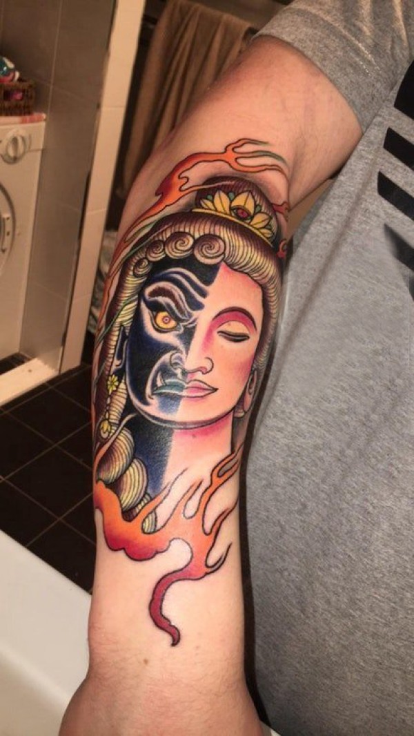 纹身佛像图男生手臂上火焰和佛像纹身图片