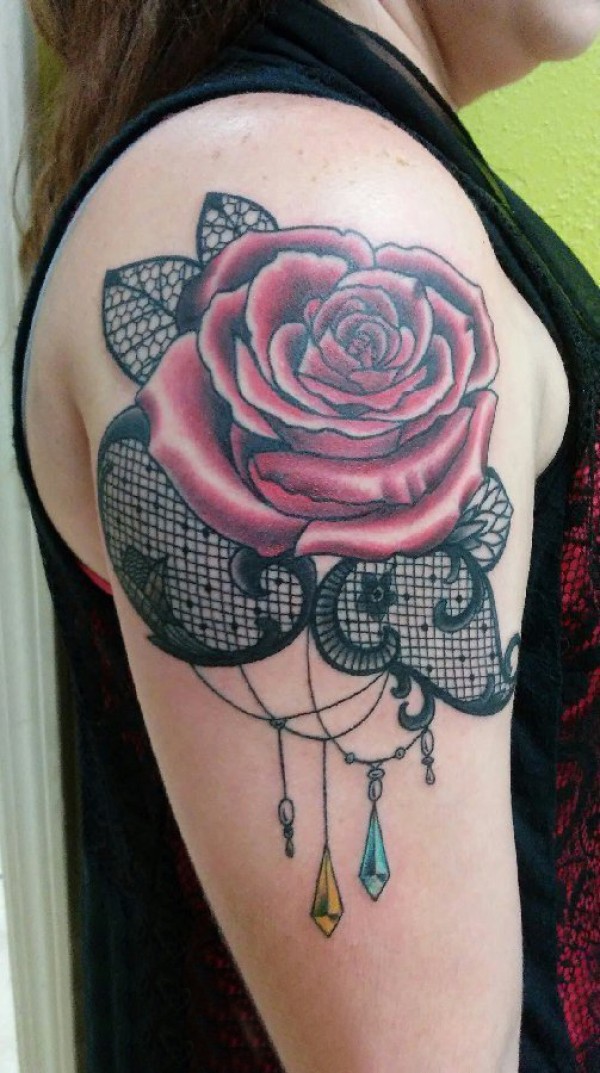 纹身玫瑰花 美女手臂上立体小纹身玫瑰花和蕾丝花边纹身图片