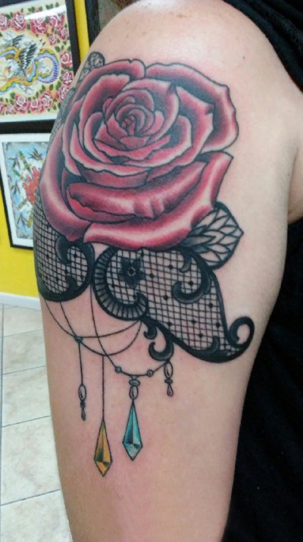 纹身玫瑰花 美女手臂上立体小纹身玫瑰花和蕾丝花边纹身图片