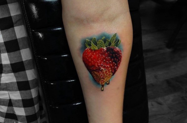 文艺手臂纹身 男生手臂上彩色的草莓纹身图片