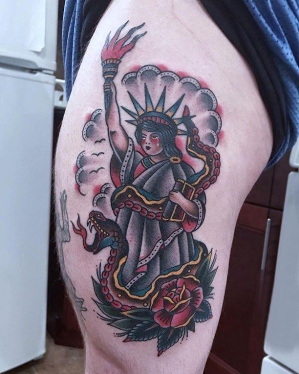 纹身自由女神 大腿上彩色传统纹身自由女神和蛇花纹身图案大全