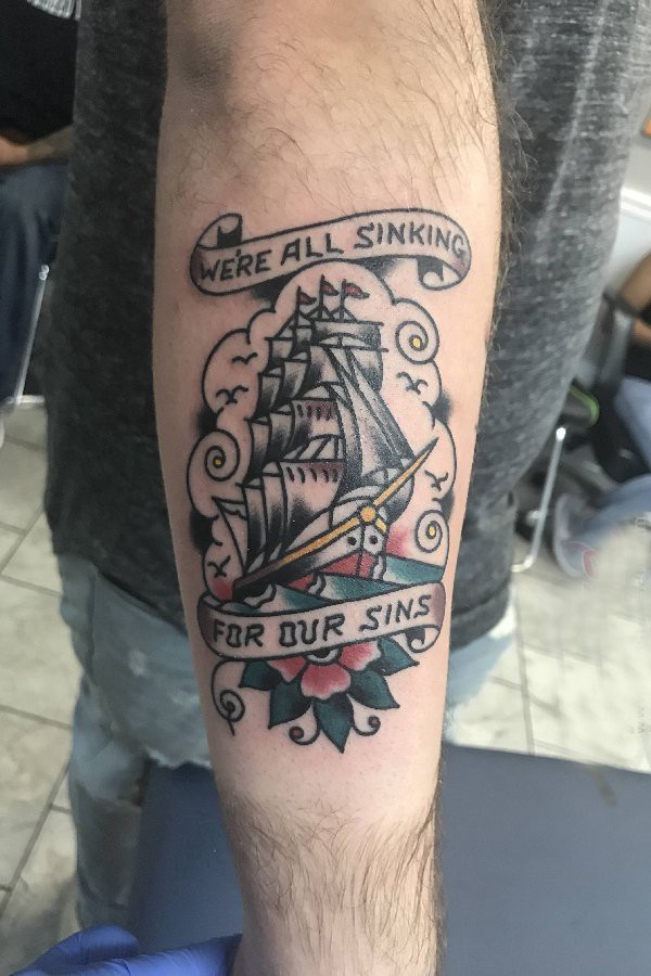 纹身小帆船 男生手臂上英文和帆船纹身图片