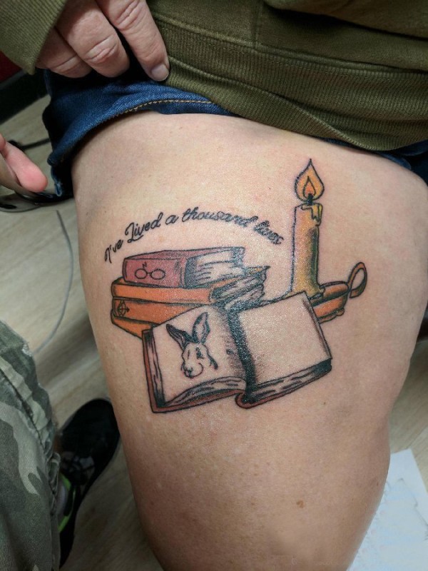 纹身书籍 男生大腿上蜡烛和书籍纹身图片